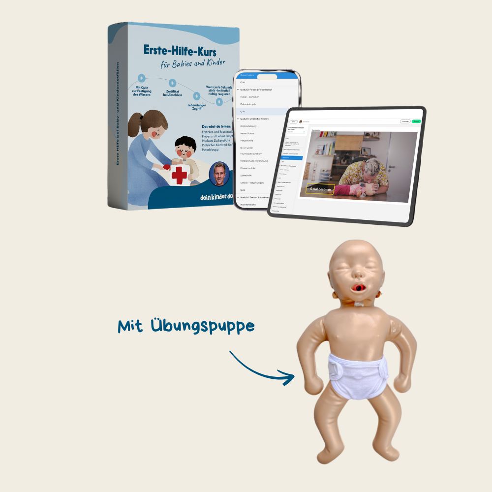 Vielleicht fällt es dir schwer, den richtigen Erste-Hilfe-Kurs zu finden. Die Auswahl scheint endlos, oft langatmig, überteuert und nicht vertrauenswürdig. Wir haben die perfekte Lösung: Kompakt zusammengefasstes Wissen, einfach verständlich für Eltern, ergänzt durch Zubehör für Zuhause, das deinen Lernprozess optimal unterstützt – und das alles zu einem fairen Preis mit Geld-Zurück-Garantie.