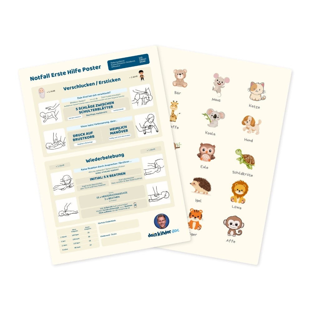 Wichtige Maßnahmen auf einen Blick: Das Kinderdoc Erste-Hilfe-Poster – die essenziellen Handgriffe für Notfälle immer griffbereit, ob in der Küche, im Kinderzimmer oder an der Wickelkommode.